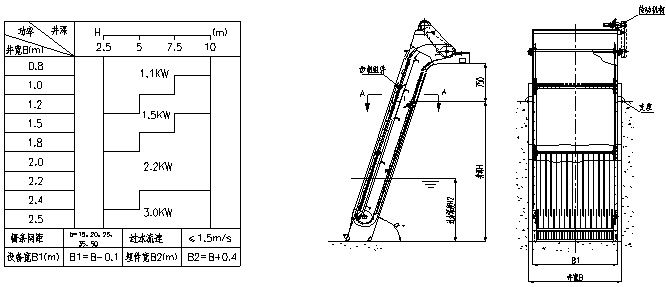 在電機驅動下,通過減速機減速后,帶動鏈輪與鏈條運動,固定在回轉鏈條上除污齒耙鏈條在柵后運動到底部,經過導輪后翻轉到柵前迎水面的位置,繼續運動插入固定柵條的間隙中上行,把柵前攔截的污物提升帶出水面,并隨著鏈條的運動到出渣口處自動翻轉,污物自卸到格柵后的輸送機或渣桶中,完成除污過程,液體則通過柵條的柵隙流過,整個工作狀態連續循環進行。